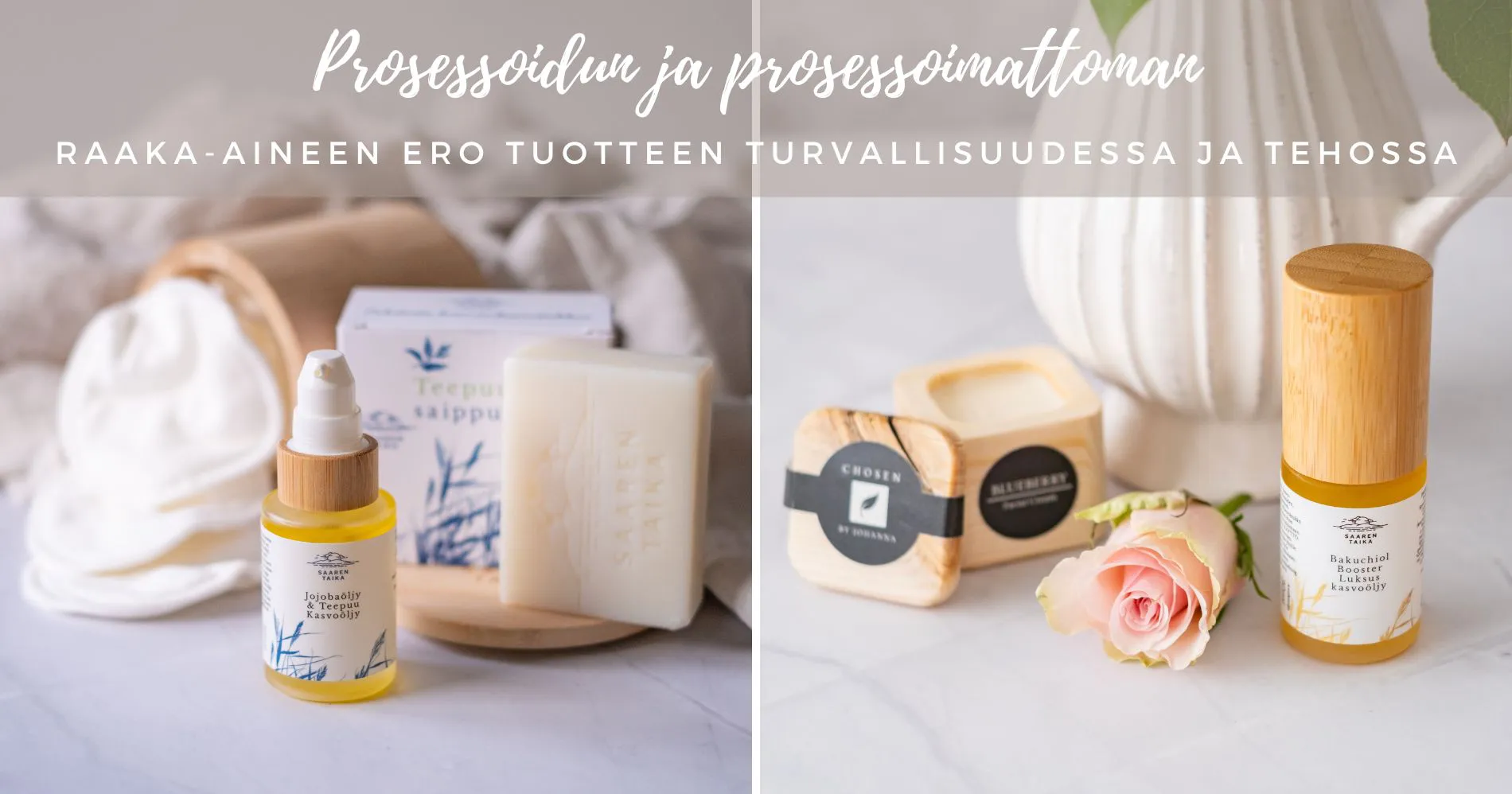 Me Saaren taiassa käytämme ensisijaisesti vain sertifioituja ja jalostamattomia luomuöljyjä tuotteissamme.