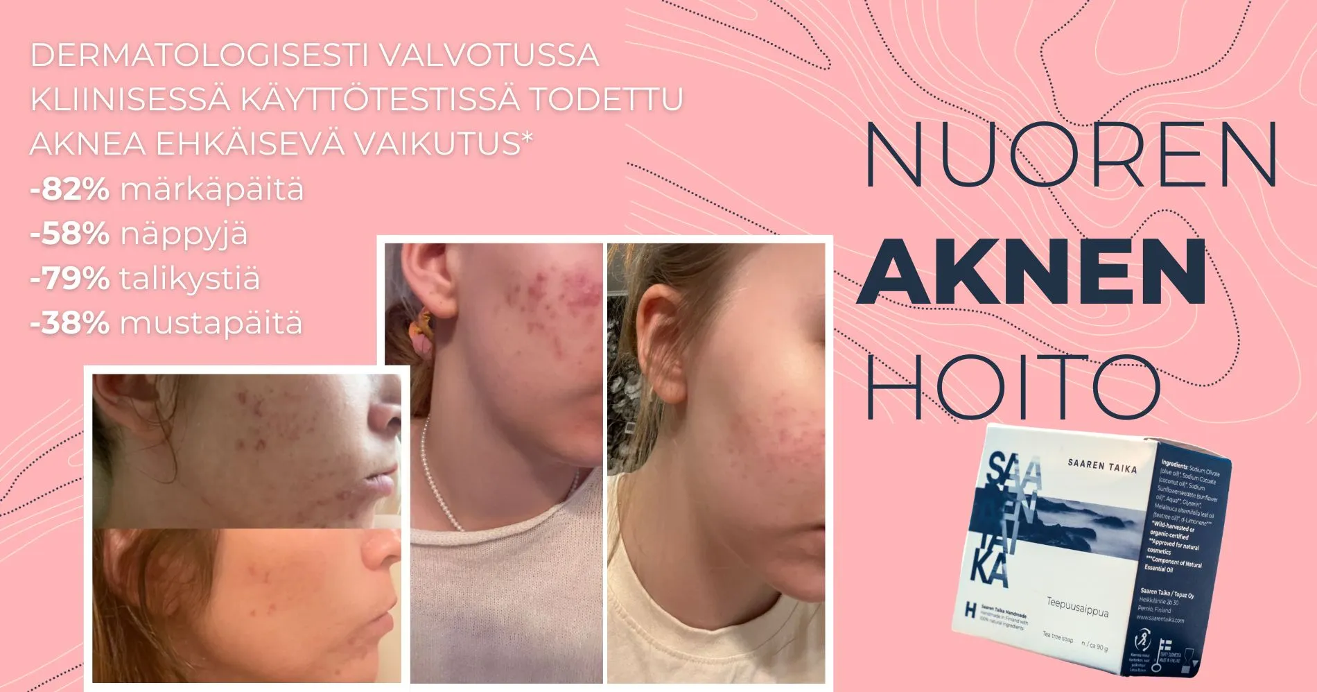 Saaren Taika Teepuusaippuan teho on todistettu dermatologin valvomassa testissä: jo 28 päivän käytön jälkeen märkäpäitä väheni 82 %, näppyjä 58 %, talikystiä 79 % ja mustapäitä 38 %.