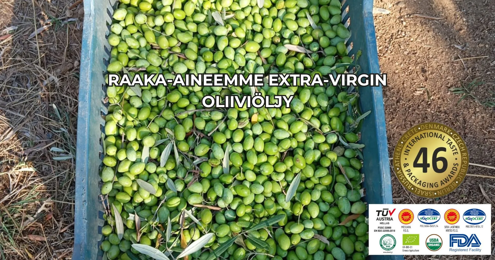 Käyttämämme oliiviöljy on voittanut kymmeniä maku- ja vastuullisuuspalkintoa, ja sillä on useita kansainvälisiä sertifikaatteja.