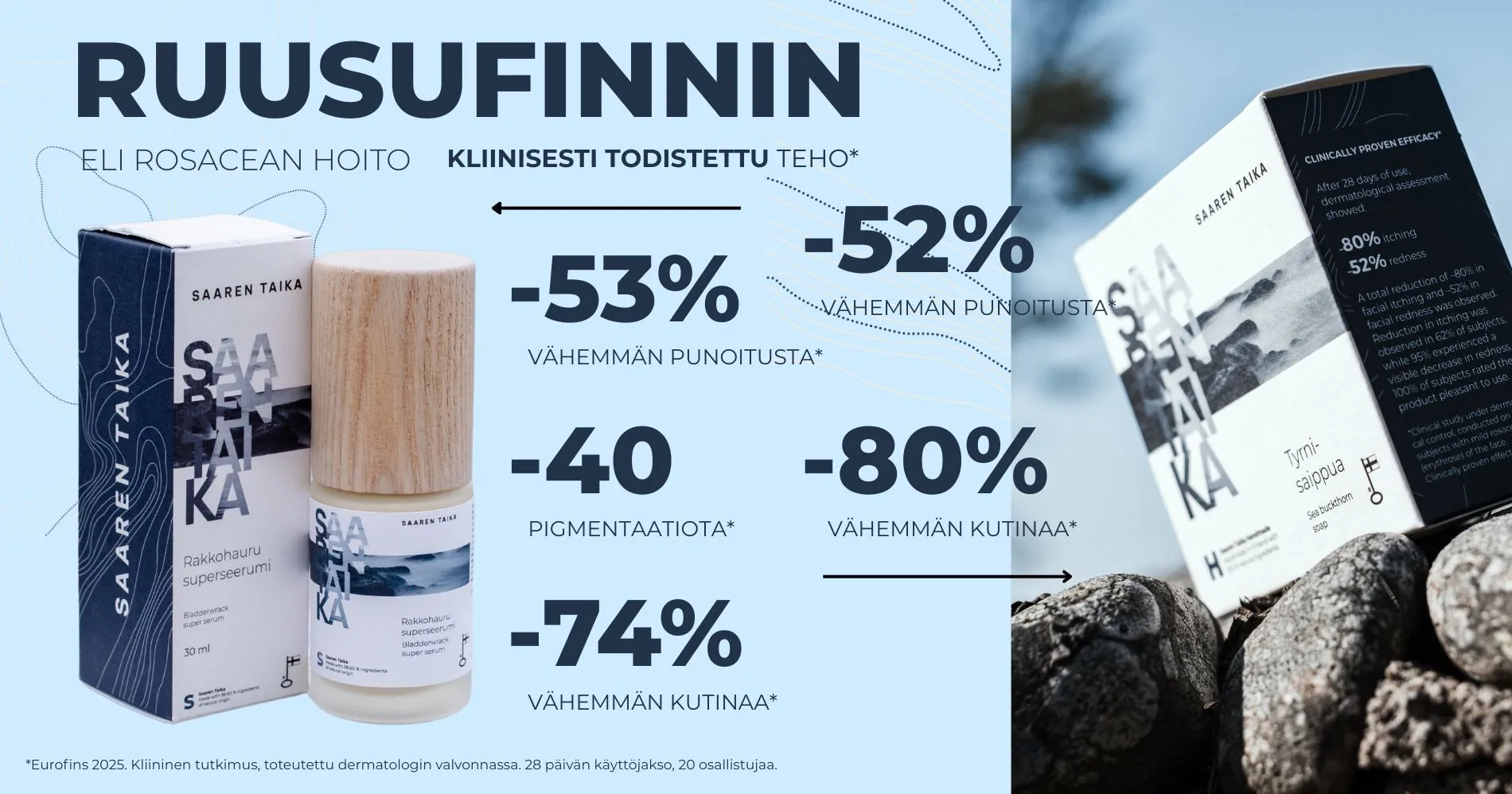 Saaren Taika on kehittänyt täysin uuden suomalaisen innovaation: Rakkohauru Superseerumin. Sen teho punoituksen ja kutinan vähentämisessä on kliinisesti todistettu: punoitus väheni 53 % jo 28 päivän käytön jälkeen*.