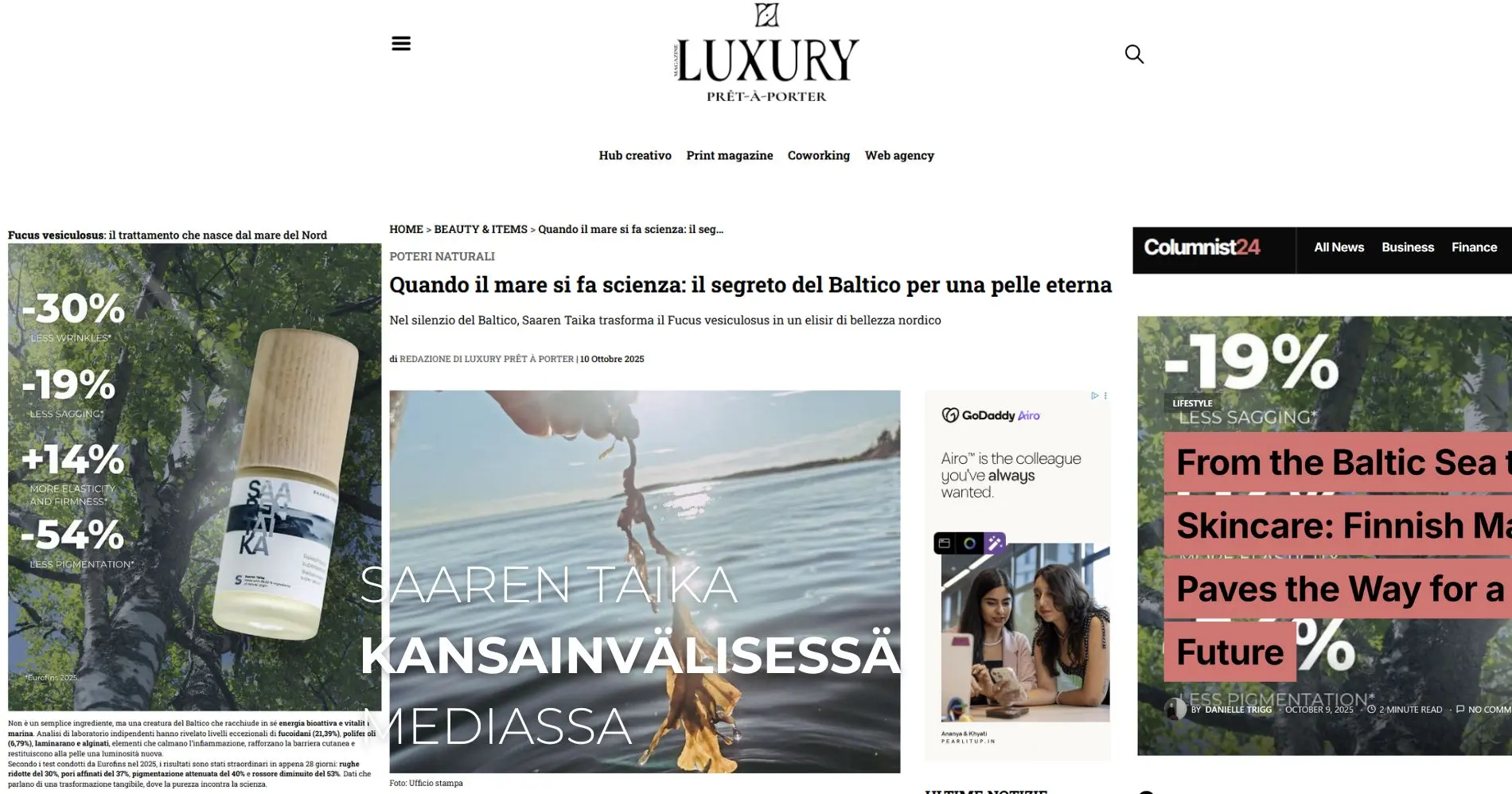 Italialainen luksus- ja muotimedia Luxury Prêt à Porter julkaisi 10. lokakuuta 2025 artikkelin Saaren Taian pohjoisesta kauneusinnovaatiosta.