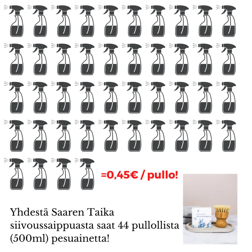 Säästä kaappitilaa ja rahaa, yhdestä Saaren Taika siivoussaippuasta saat 44 pullollista (500ml) pesuainetta! Se tekee siis n. 0,45€ / pullo!